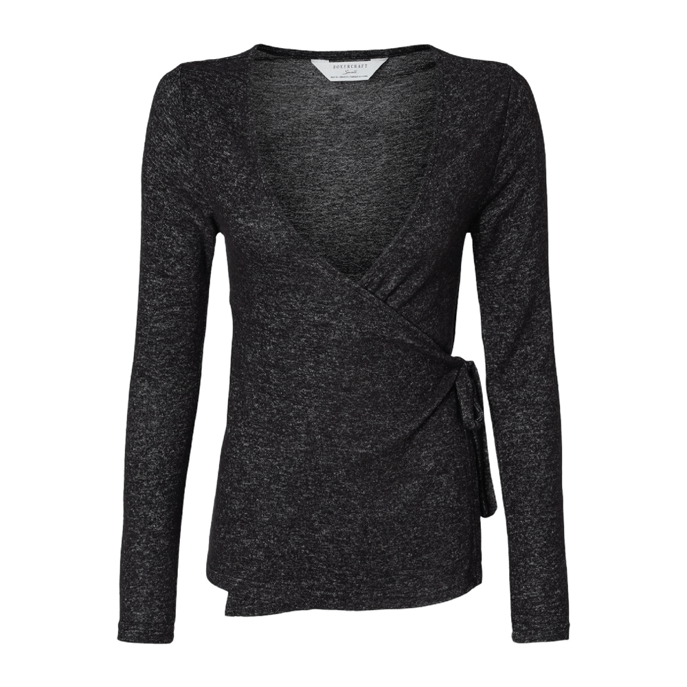 Made from 6.2 oz./yd², 80/17/3 viscose/poly/elastane, this wrap fit top features a neck & front opening finished with self ¼" facing and self-fabric ties.